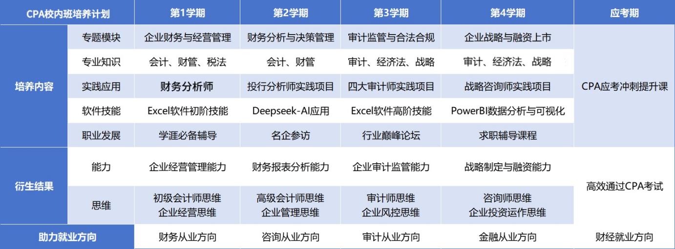 CPA校内班的课程设置聚焦专业知识、实践应用、技能提升三大人才培养维度,助力学生搭建系统的 CPA 专业知识体系,为达成持证目标奠定基础;通过实践教学引导学生了解财会行业实际运作,培养多岗位适配的实践应用能力;同时提升学生数据处理、智能工具运用等实用技能,助力其成长为符合行业需求的财经专业人才,为未来职业发展做好准备。